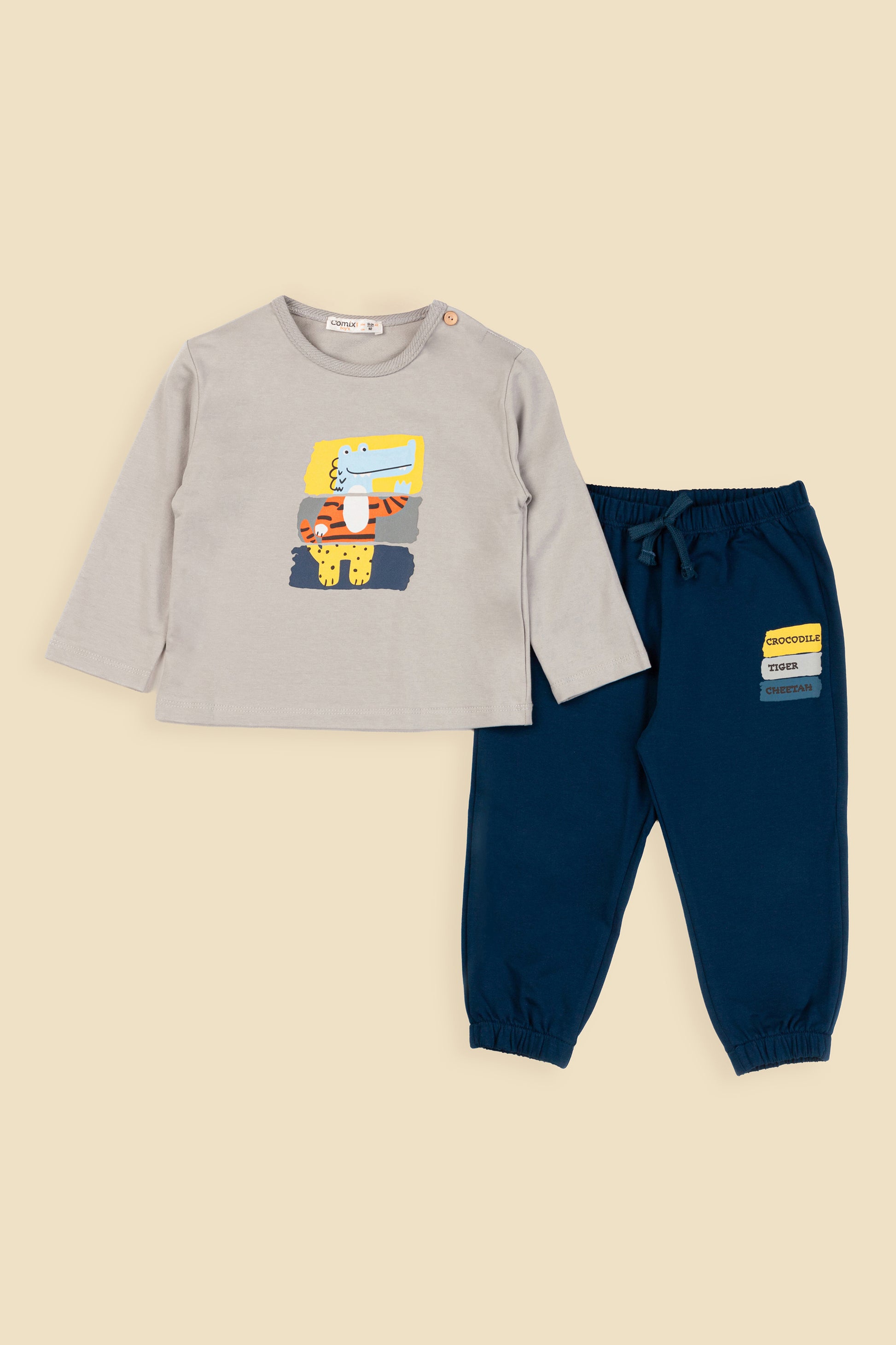 Üst kısmındaki sevimli hayvan karakterleri ve altındaki “crocodile, tiger, cheetah” yazı detayları ile eğlenceli bir görünüm kazandıran takım, oyun saatlerinden günlük gezilere kadar her an için keyifli bir stil sunar.