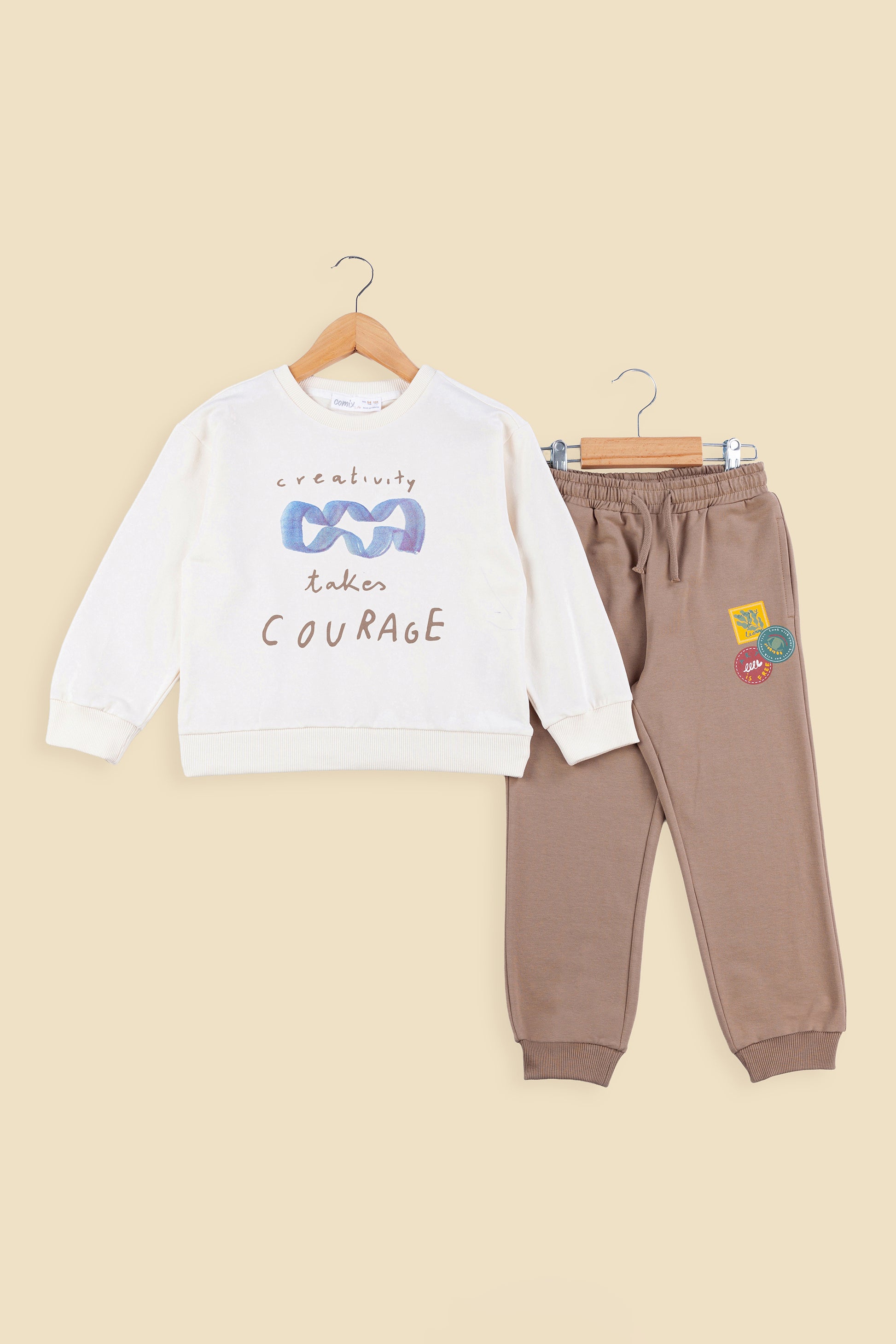 Bu iki iplik pamuklu çocuk takımı, rahat kalıbı ve yumuşak dokusu ile miniklerin gün boyu konforunu sağlar. Ekru rengindeki üst kısmında yer alan “Creativity Takes Courage” yazısı ve soyut grafik baskısı modern bir görünüm sunar. Toprak tonlarındaki alt kısmın paça ve bel lastiği hareket özgürlüğü sağlarken, üzerindeki renkli rozet baskıları takıma eğlenceli bir detay katar.