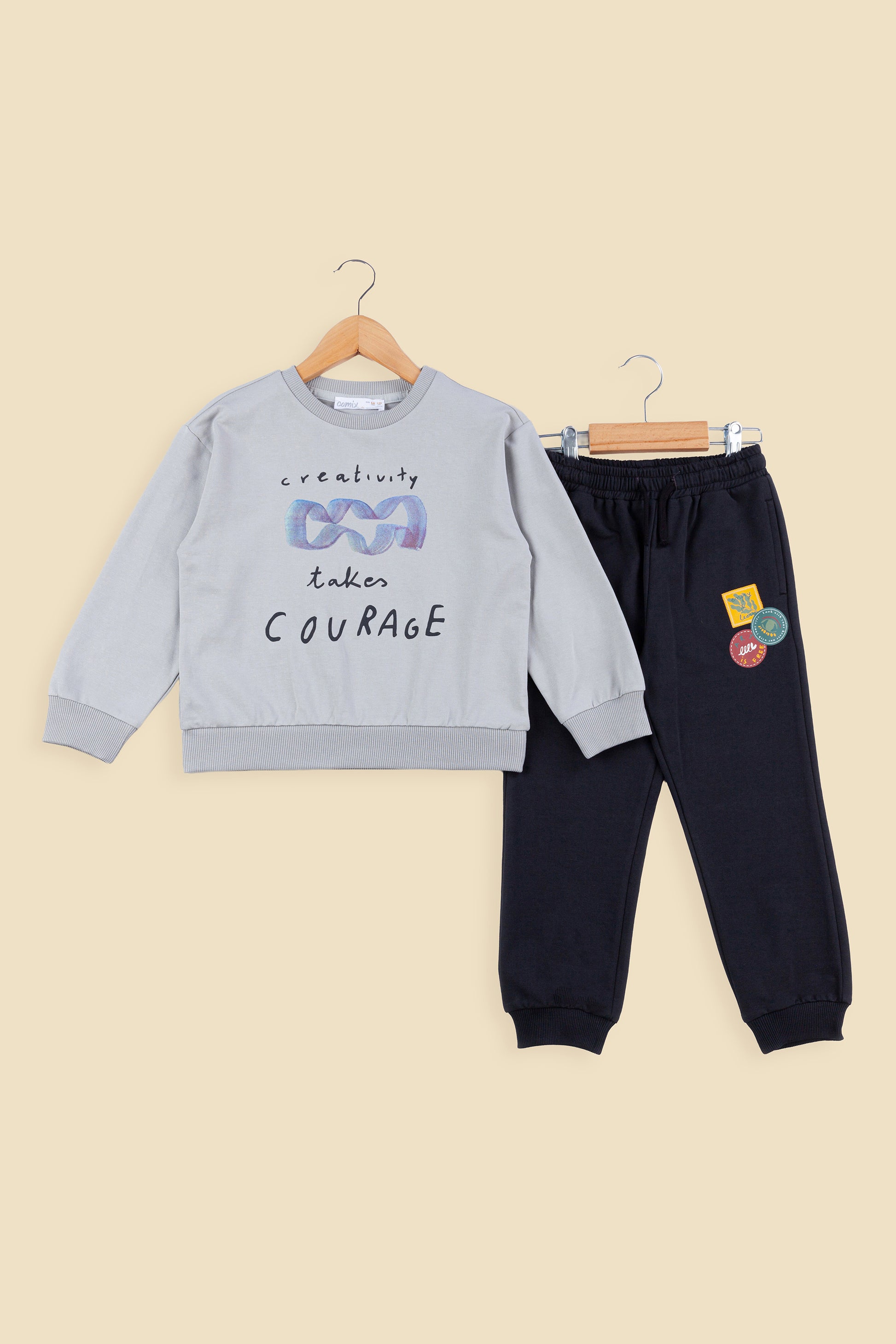 Bu iki iplik pamuklu çocuk takımı, rahat kalıbı ve yumuşak dokusu ile miniklerin gün boyu konforunu sağlar. Ekru rengindeki üst kısmında yer alan “Creativity Takes Courage” yazısı ve soyut grafik baskısı modern bir görünüm sunar. Toprak tonlarındaki alt kısmın paça ve bel lastiği hareket özgürlüğü sağlarken, üzerindeki renkli rozet baskıları takıma eğlenceli bir detay katar.