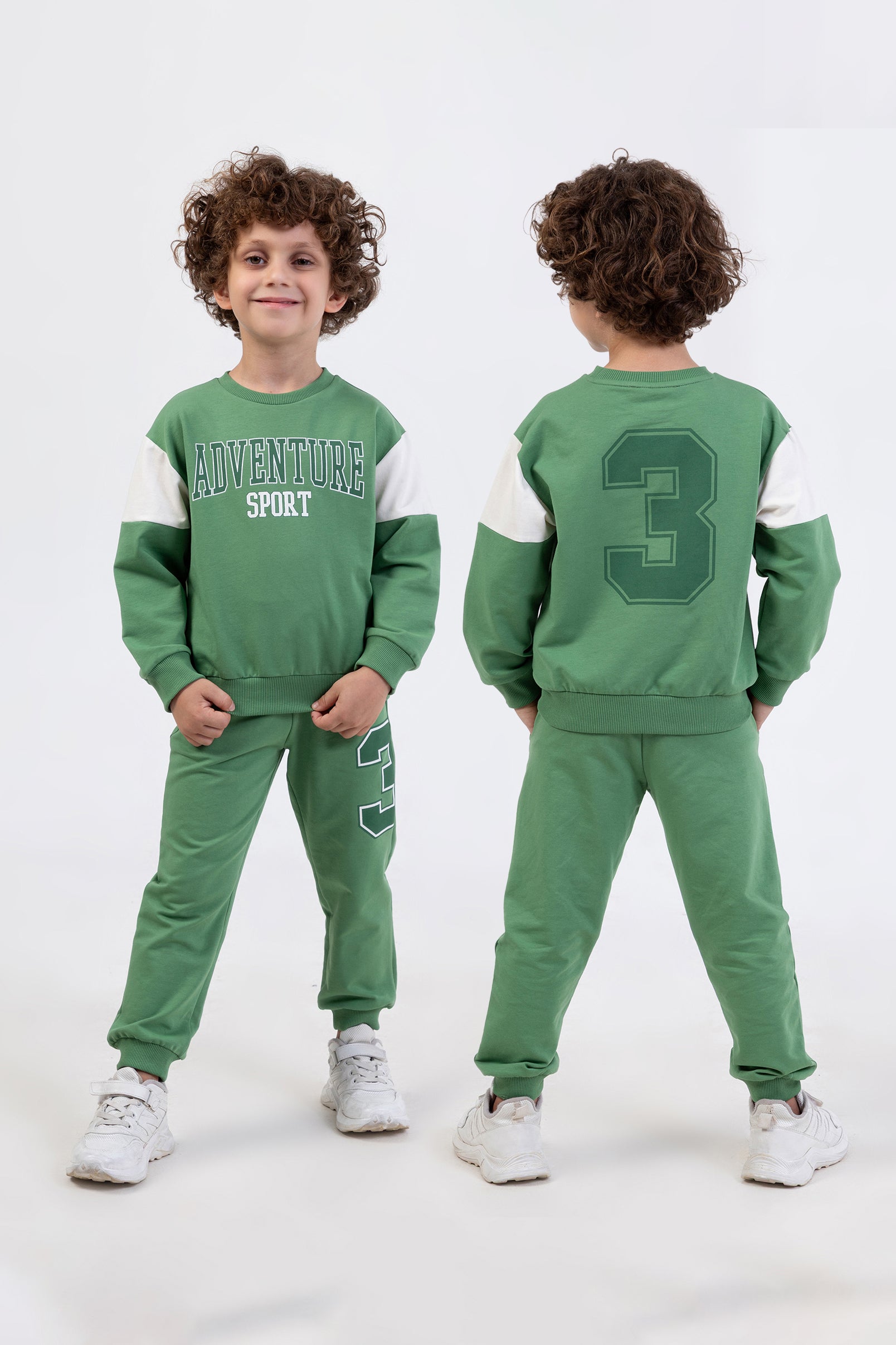 İki iplik pamuklu kumaştan üretilen bu çocuk takımı, yumuşak dokusu ve nefes alabilen yapısıyla miniklere gün boyu rahatlık sunar. Sportif ve enerjik “Adventure Sport” baskısı, modern kol blok detaylarıyla tamamlanarak hareketli bir stil oluşturur.