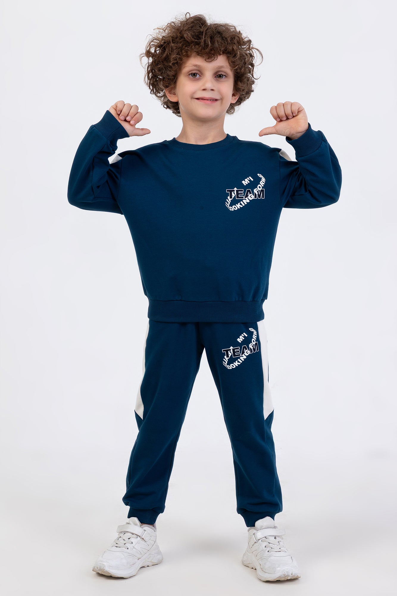 Bu iki iplik pamuklu çocuk takımı, yumuşak kumaşı ve esnek yapısıyla miniklerin gün boyu rahat etmesini sağlar. Omuzdan bileğe ve pantolon yanlarında yer alan beyaz şerit detayları, gri tonuna sportif bir dinamizm katar. Göğüs ve pantolon üzerindeki “My Team” baskısı ise enerjik bir stil sunar.