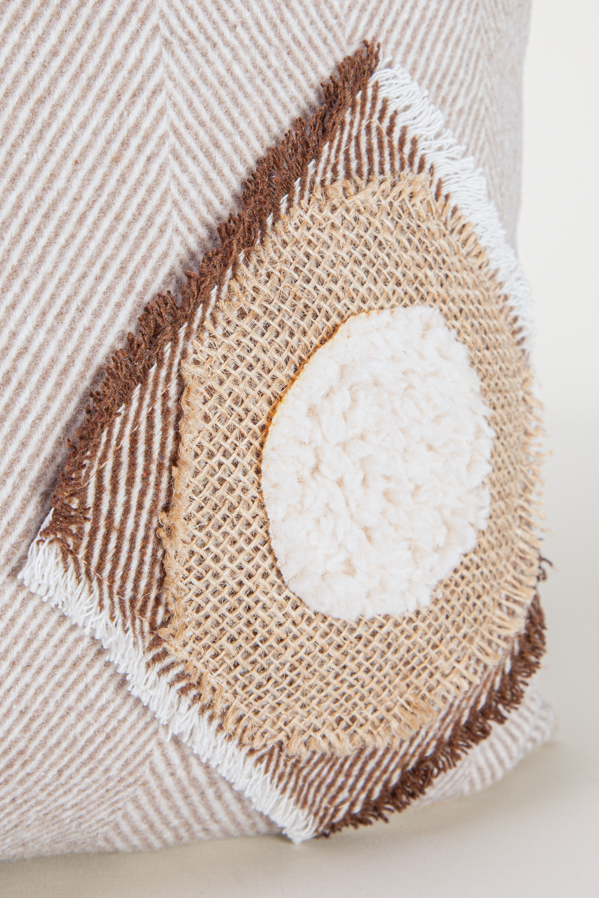 Renk: Bej, kum ve doğal tonların birleşiminden oluşan sade yüzey; kahve ve krem uygulamalı applique
