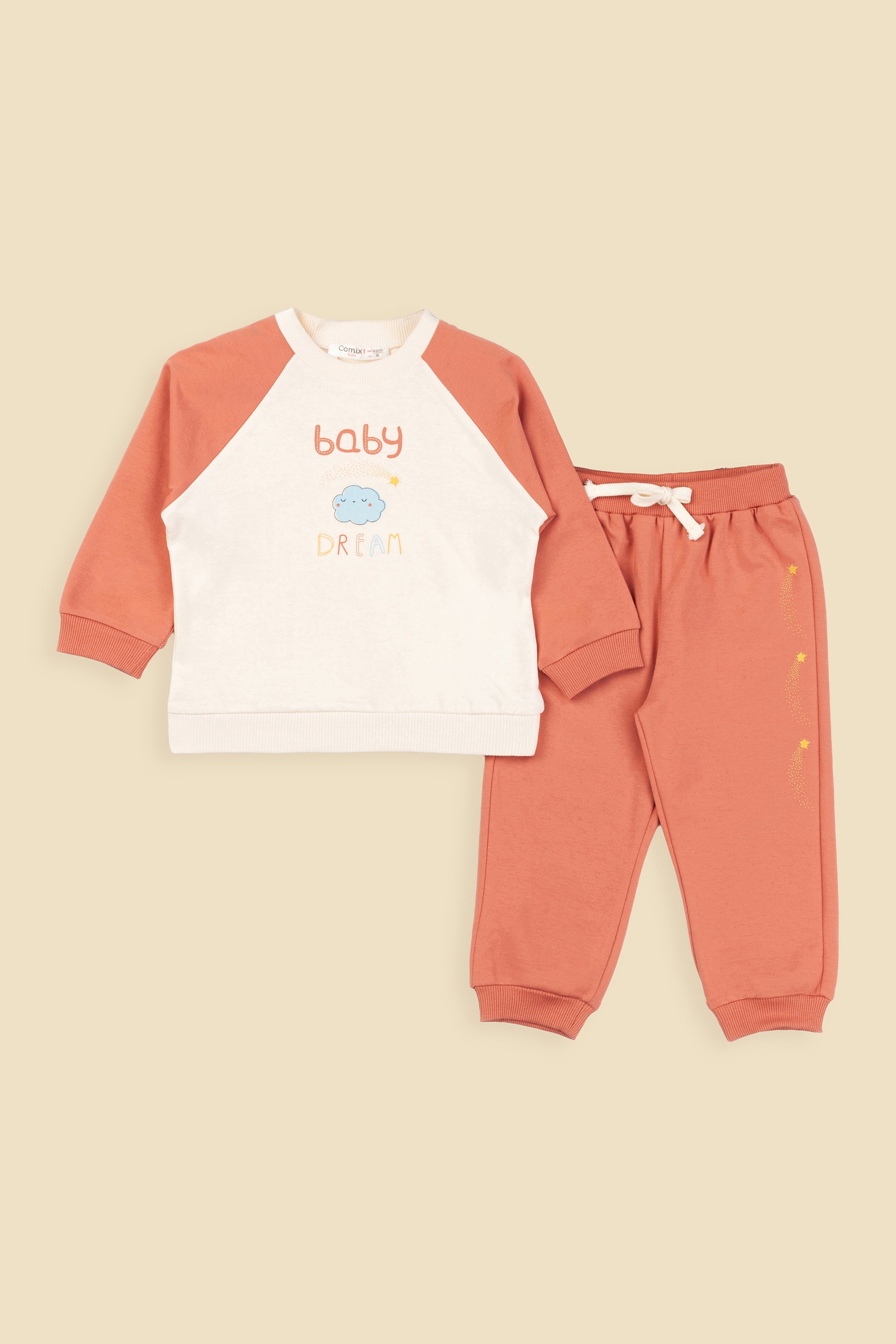 Ön kısmındaki “baby dream” yazısı ve bulut deseni ile tatlı bir görünüm kazandıran takım, oyun saatlerinden günlük gezilere kadar her an için keyifli bir stil sunar.