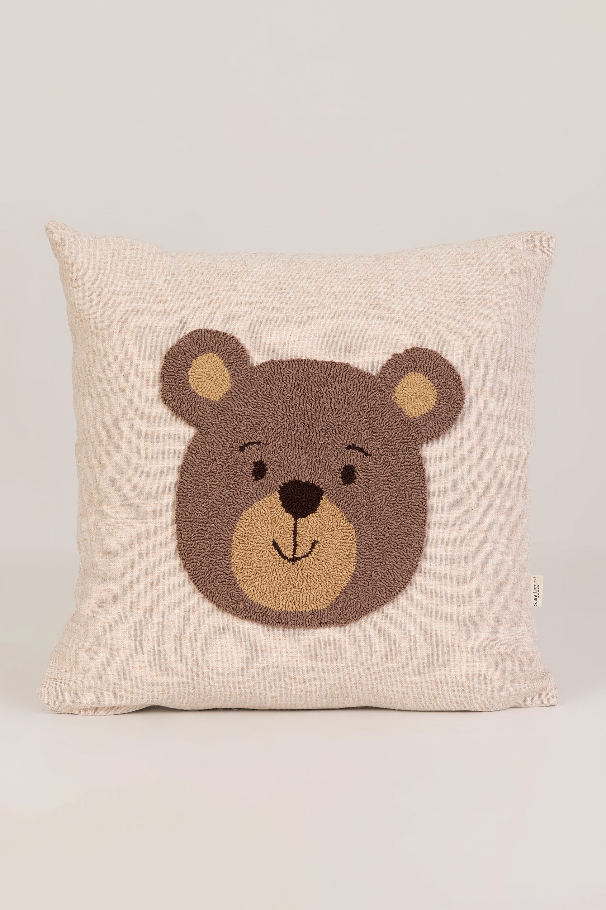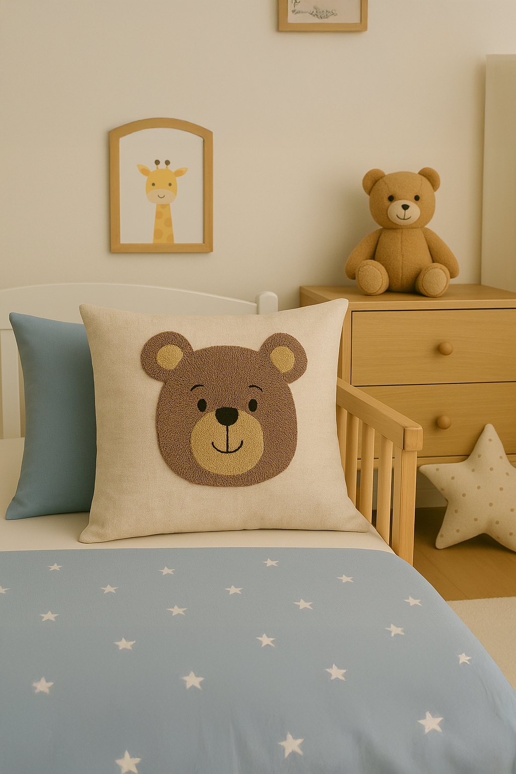 Yüksek kaliteli doğal dokulu kumaştan üretilmiş bu kırlent, elde işlenmiş güler yüzlü ayıcık motifiyle çocuk odalarına sıcaklık, sevecenlik ve pozitif bir enerji kazandırır. Sade çizgileri ve yumuşak renk geçişleriyle hem bebek hem çocuk odaları için ideal bir dekoratif tamamlayıcıdır.
