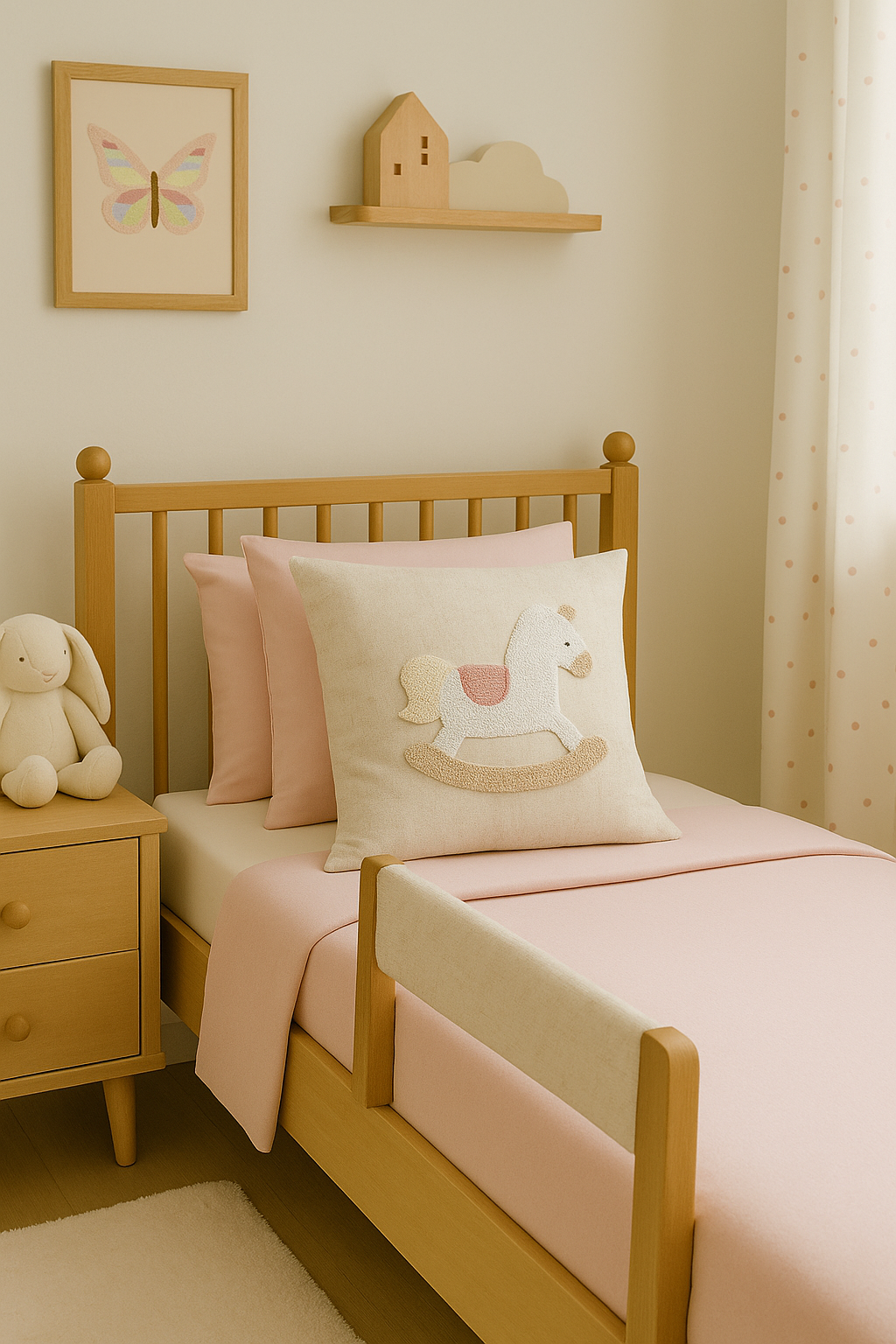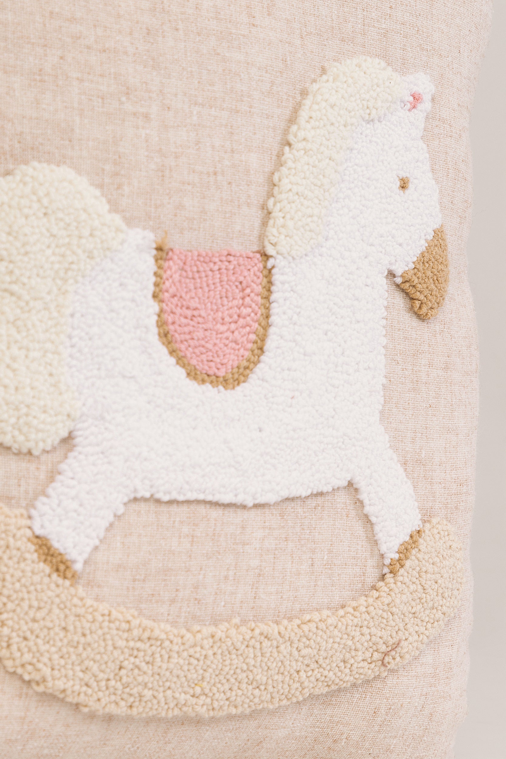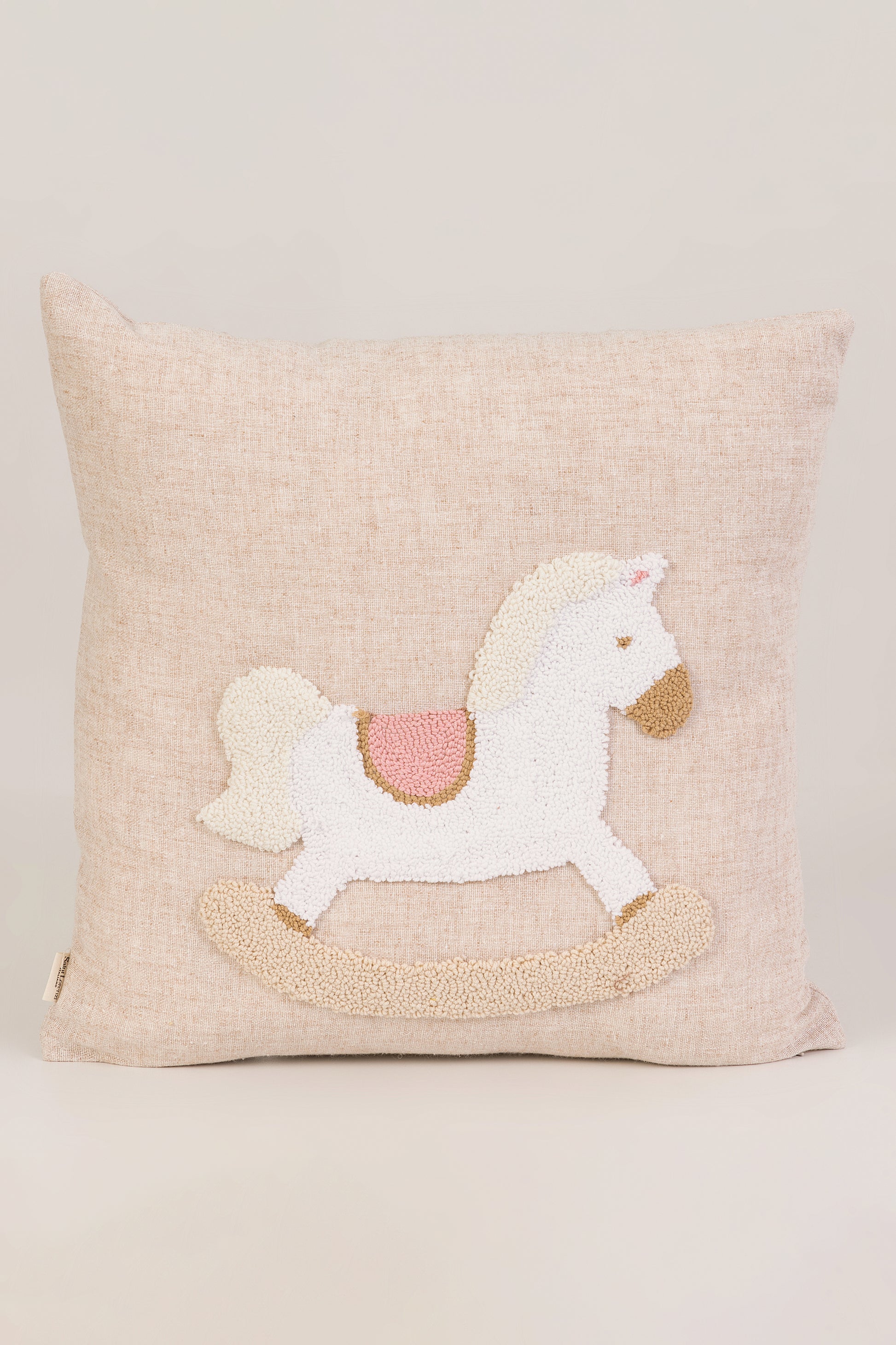 Yüksek kaliteli doğal dokulu kumaştan üretilmiş bu kırlent, elde işlenmiş nostaljik sallanan at motifiyle çocuk odalarına sıcak, sevimli ve oyuncak temalı bir atmosfer kazandırır. Pastel tonları ve yumuşak dokusuyla klasik bebek odalarına zarif bir uyum sağlar.