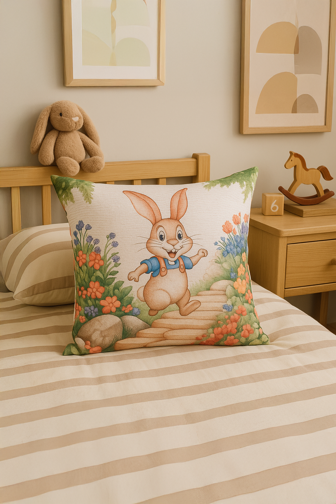 Çiçeklerle çevrili bir patikada neşeyle zıplayan tavşan figürü, çocuklara yönelik dekorasyonlara eğlenceli ve enerjik bir hava katar. Canlı renkleri ve detaylı illüstrasyonuyla çocuk odaları, oyun alanları veya bebek köşeleri için masalsı bir atmosfer yaratır.