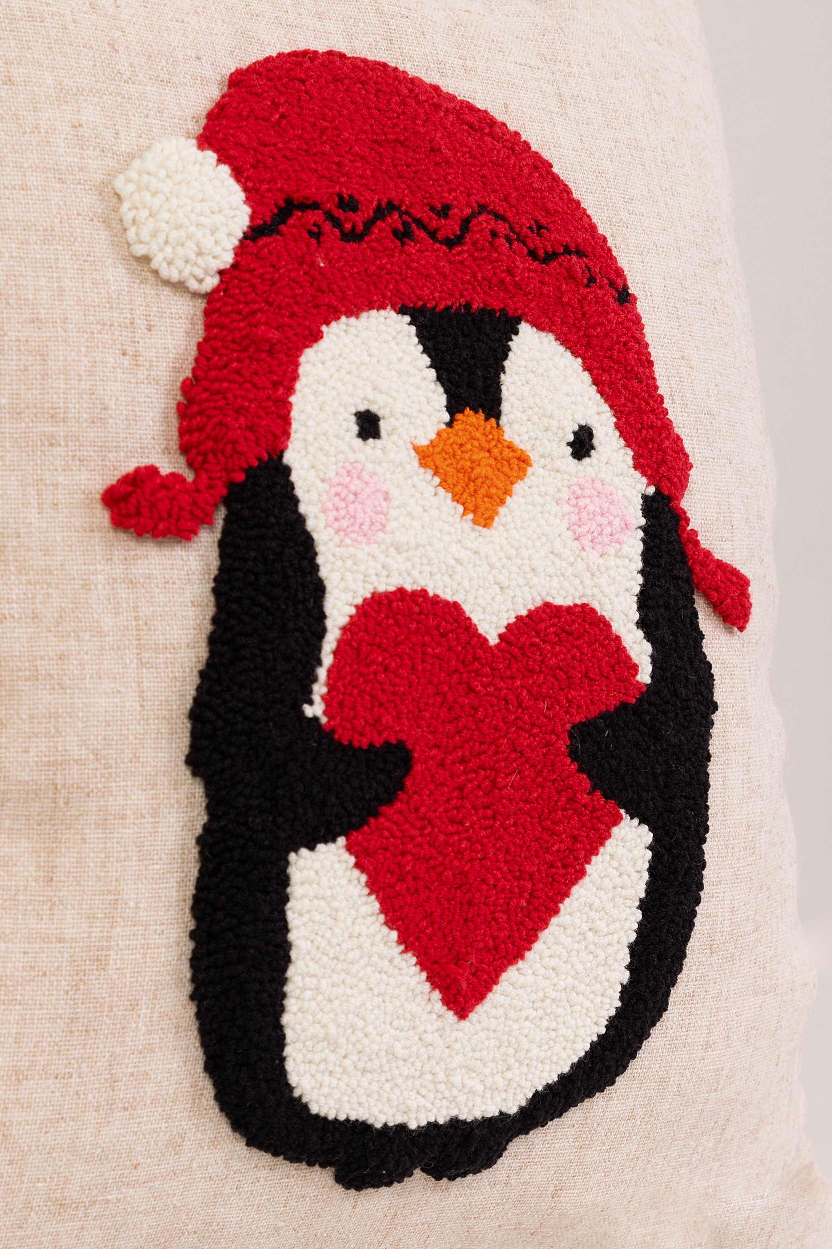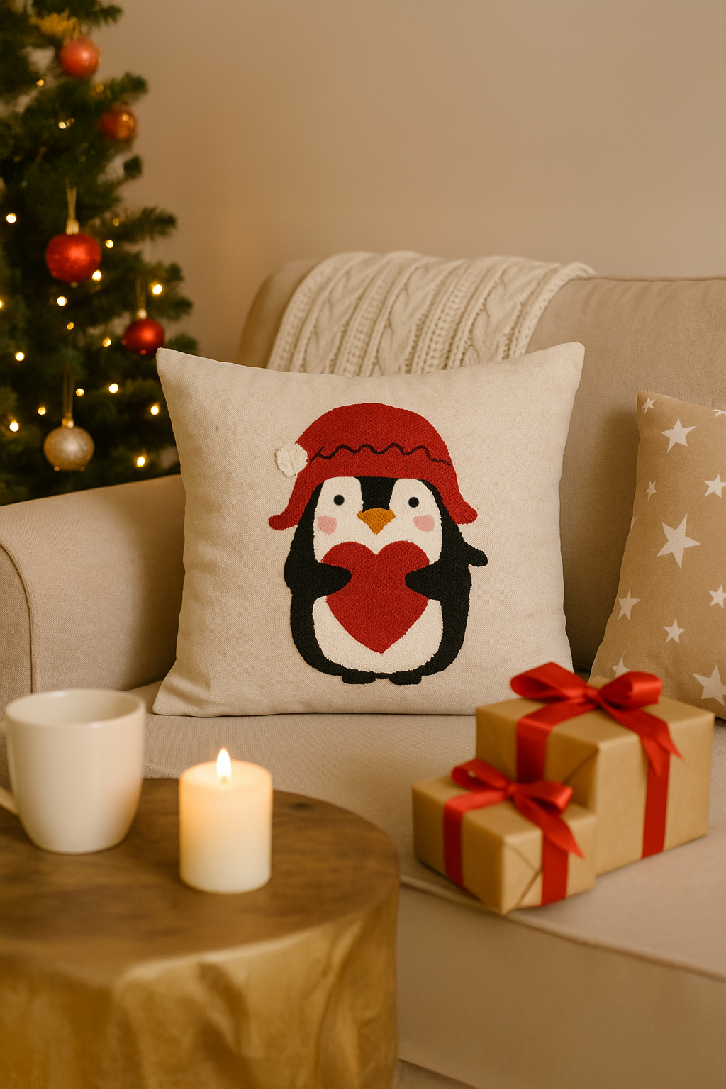 Yüksek kaliteli doğal dokulu kumaştan üretilmiş bu kırlent, elde işlenmiş kırmızı bereli penguen motifiyle çocuk odalarına neşeli, sevecen ve kış temalı bir atmosfer kazandırır. Kucakladığı kalp detayıyla sıcaklık ve sevgi yayan bu tasarım, kış dekorasyonları için ideal bir tamamlayıcıdır.
