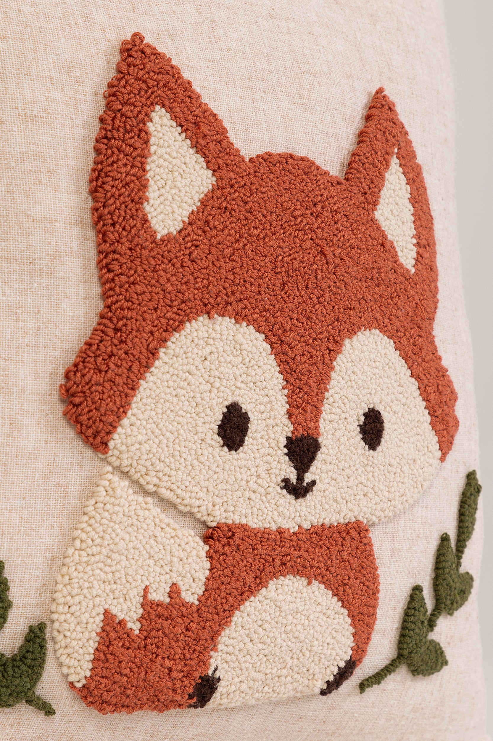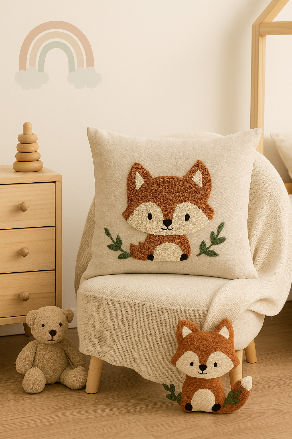 Yüksek kaliteli doğal dokulu kumaştan üretilmiş bu kırlent, elde işlenmiş tilki motifi ve yeşil yaprak detaylarıyla çocuk odalarına doğal, neşeli ve masalsı bir hava kazandırır. Sade fonu ve sıcak tonlarıyla hem modern hem de rustik dekorasyonlara uyum sağlar.