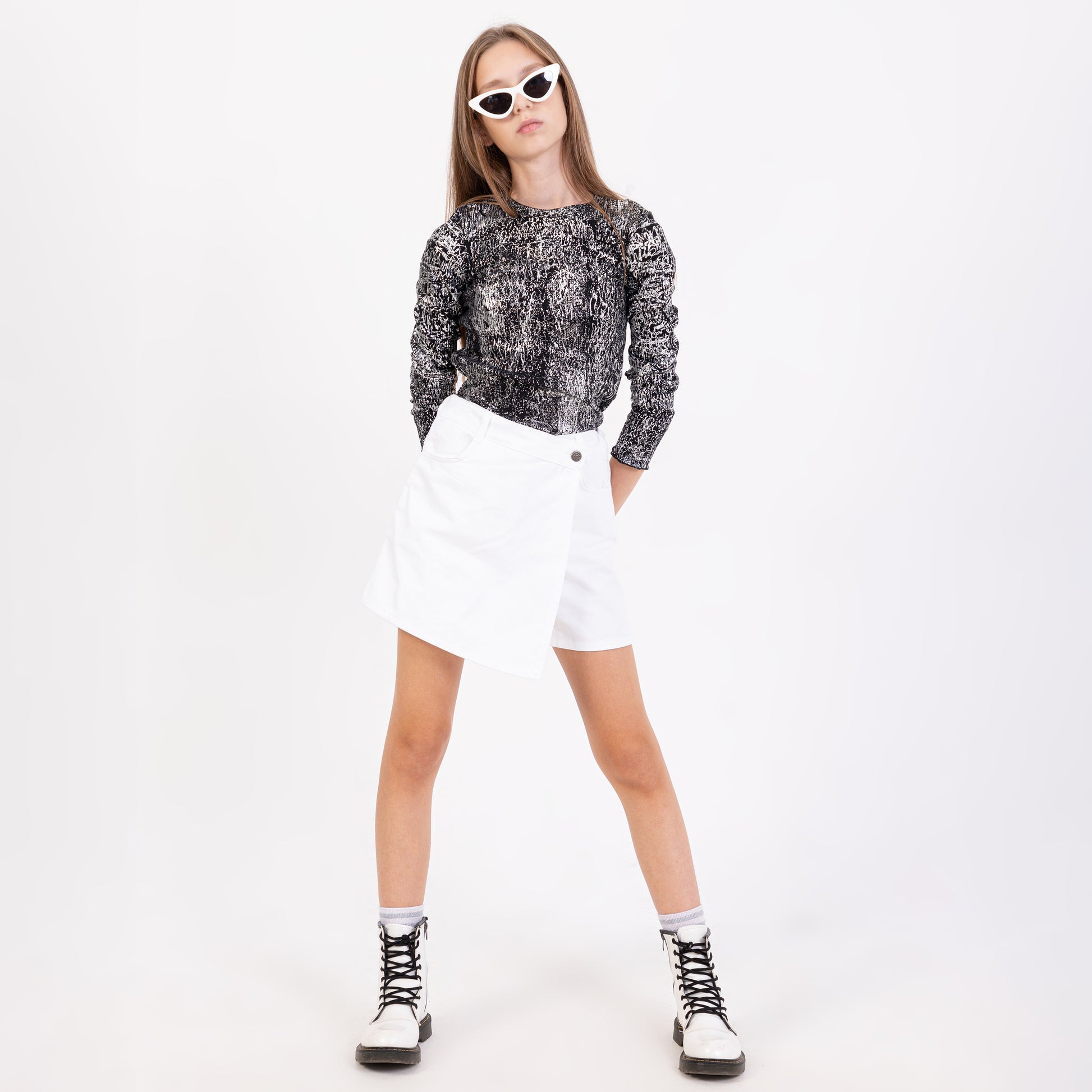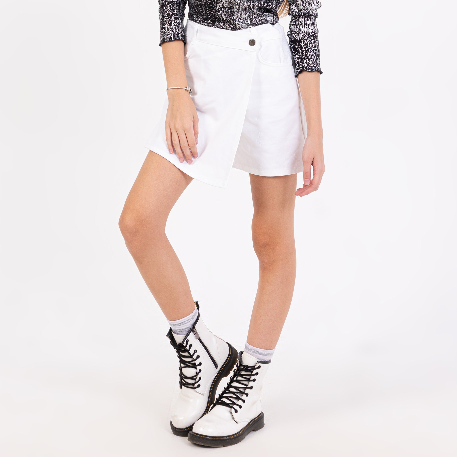 Asimetrik ön detayıyla modern bir stil sunan bu kız çocuk beyaz şort-etek, etek görünümü ve şort rahatlığını bir araya getiriyor. Yumuşak pamuklu dokusu sayesinde gün boyu konforlu kullanım sağlarken, şık kesimi ile hem günlük hem de özel kombinlere kolayca uyum sağlar. Basic tişörtlerden şık bluzlara kadar pek çok parça ile zahmetsizce eşleşir.