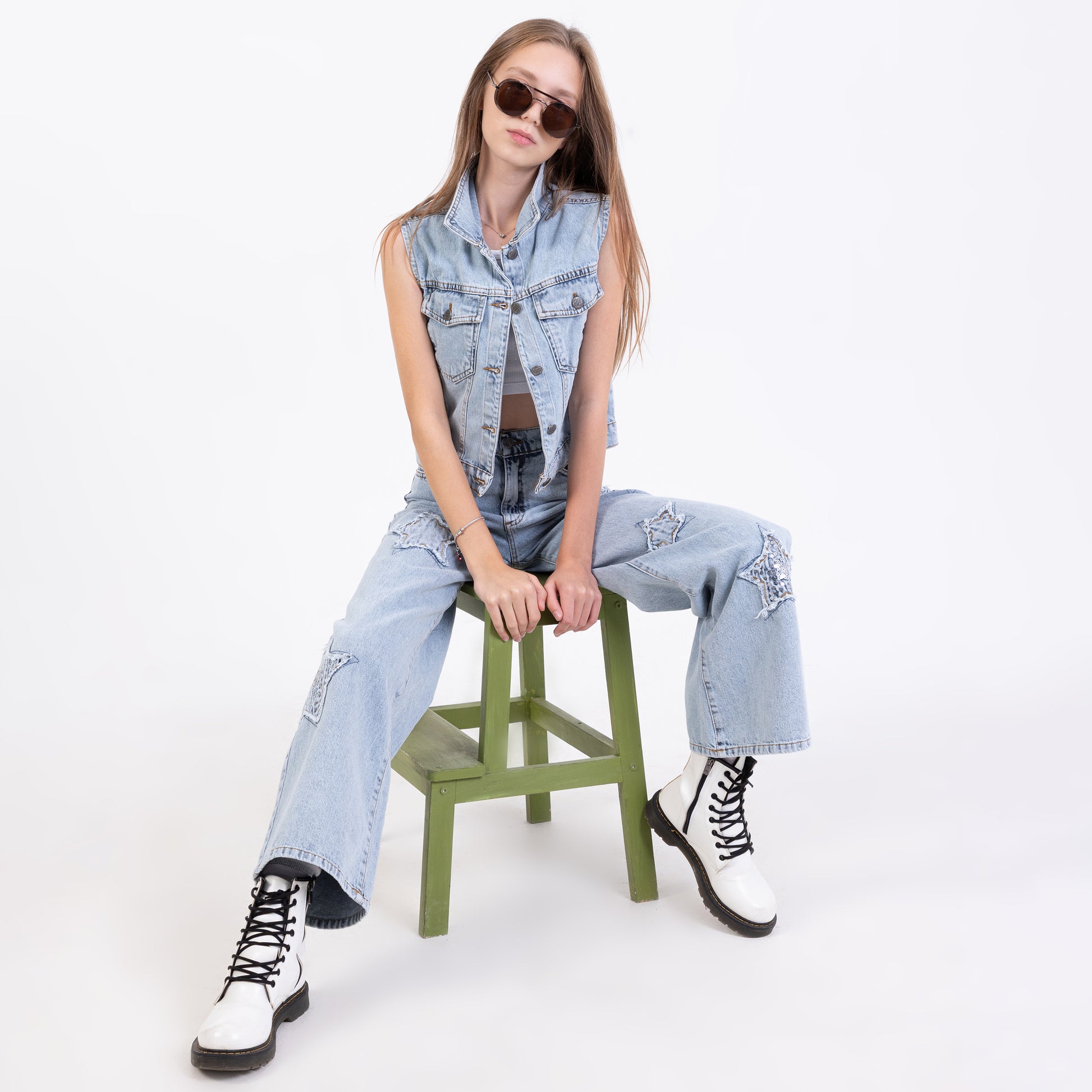 Materyal: %100 pamuk denim, parlak yıldız işlemeli