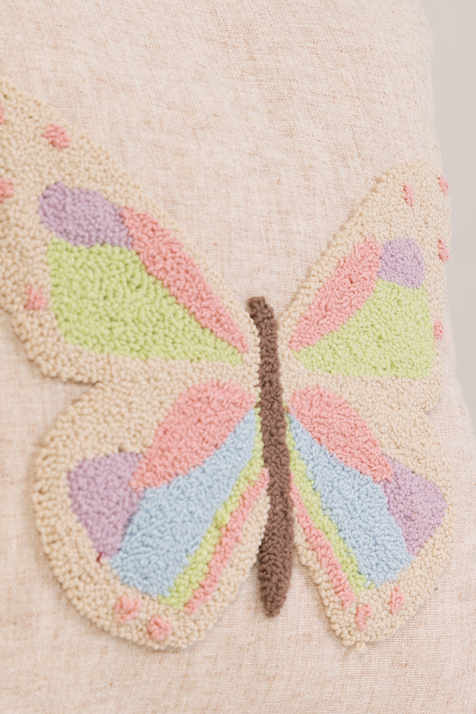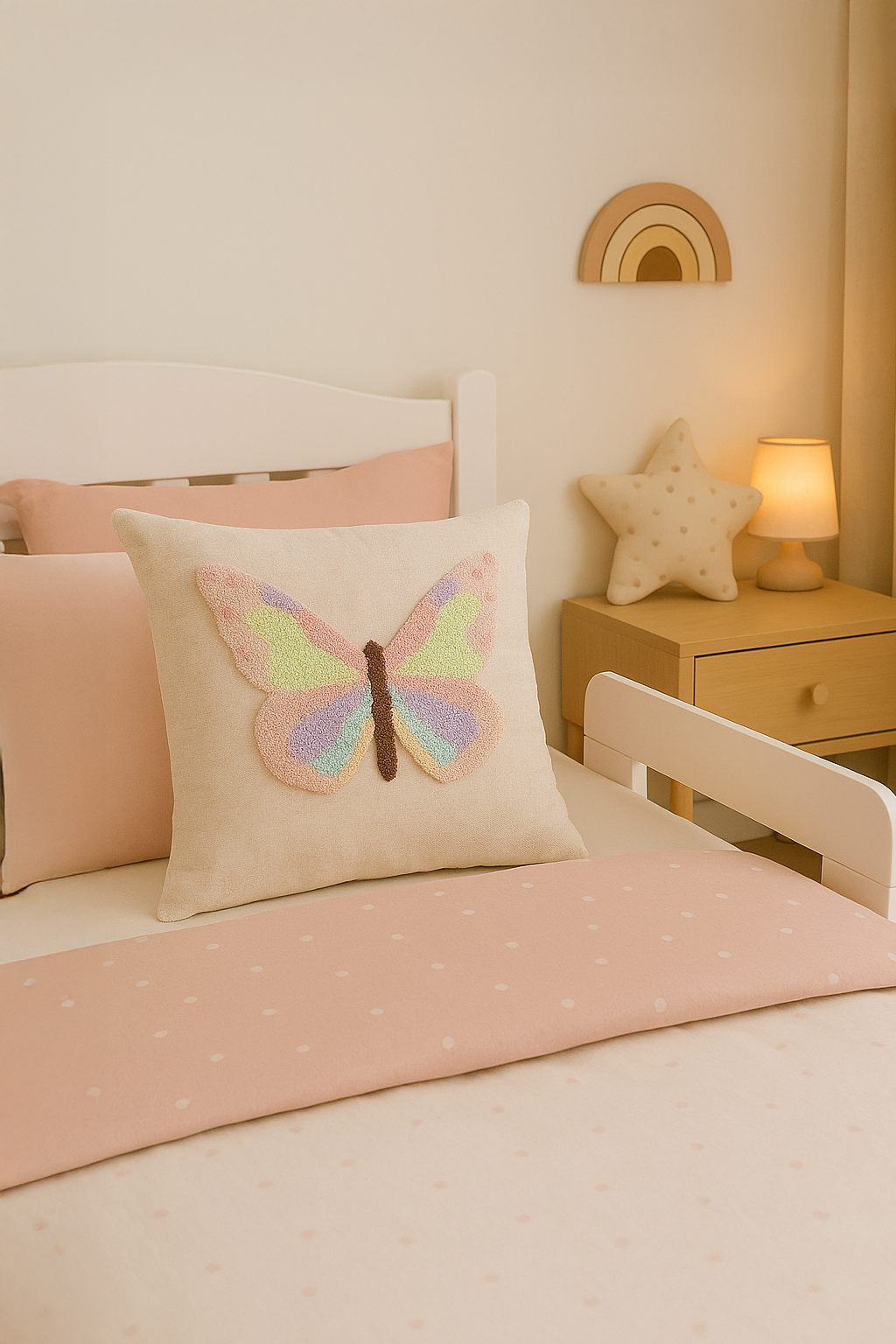 Yüksek kaliteli doğal dokulu kumaştan üretilmiş bu kırlent, elde işlenmiş renkli kelebek motifiyle çocuk odalarına zarif, neşeli ve doğayla iç içe bir atmosfer kazandırır. Uçuşan pastel renkleriyle hem huzurlu bir görünüm sunar hem de dekorasyona hafiflik ve hareket katar.